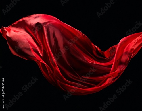 © Beate Vogl, Fototapeta premium Ein roter durchsichtiger Seidenschal weht im Wind, schwarzer Hintergrund