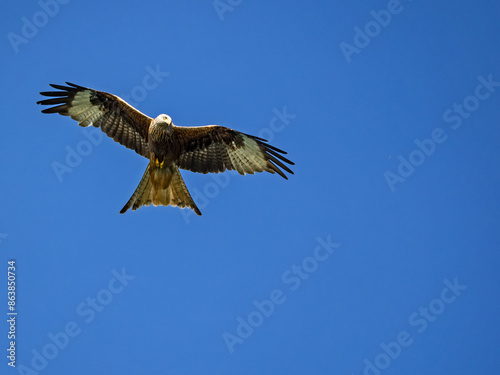 Obraz premium Ein Rotmilan (Milvus milvus) im Flug vor blauem Himmel