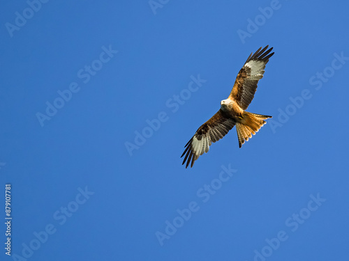 Obraz premium Ein Rotmilan (Milvus milvus) im Flug vor blauem Himmel