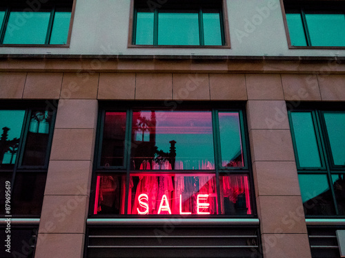 © Manuela Ewers, Obraz premium Ein "Sale"-Neonschild in dem Schaufenster eines Bekleidungsgeschäfts färbt die Kleidung rot, während die umliegenden Fenster türkis wirken.