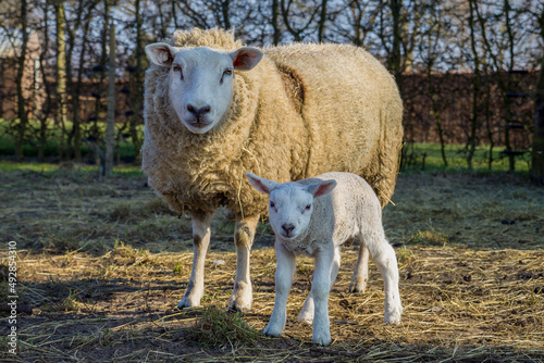 © jsr548, Fototapeta premium ein Schaf mit ihrem Lamm steht auf einer Weide