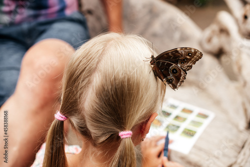 © Alena Vilgelm, Fototapeta premium Ein Schmetterling sitzt auf dem Kopf eines Mädchens