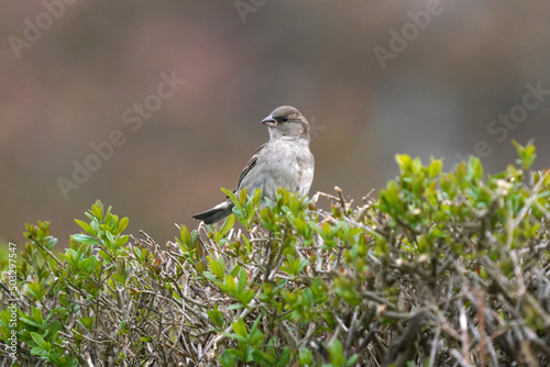 Fototapeta premium Ein Spatz sitzt auf der Hecke und schaut um sich.