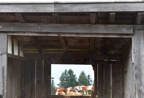 © Sigena, Obraz premium Ein Stall und dahinter Kühe auf der Weide bei Völs am Schlern in Südtirol