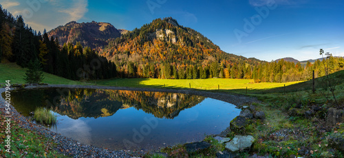 Obraz premium ein Teich bei der Alpe Krähenberg, Sibratsgfäll, in dem sich der herbstlich...