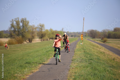 © Anke Thomass, Fototapeta premium Ein Vater macht mit seinen Kindern eine Radtour auf dem Oderdamm während der Corona-Krise am 13.04.2020.