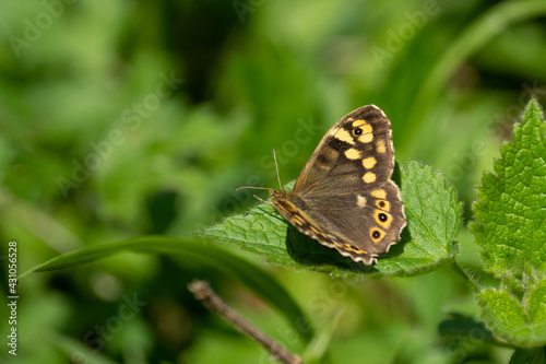 © Kay, Fototapeta premium ein Waldbrettspiel Schmetterling sitzt auf einen Grünen Blatt im Sonnenschein