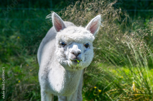 Obraz premium ein weißes Alpacas auf einer Wiese im Sommer