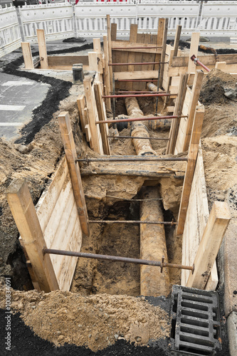 © fefufoto, Obraz premium Eine alte grosse Gasleitung aus Stahlguss in einer Baugrube