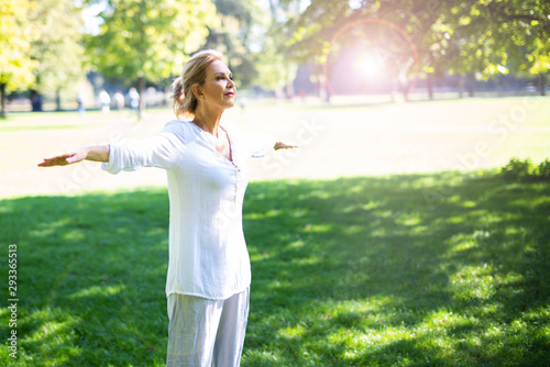 Fototapeta premium Eine attraktive Best-Ager Frau macht Meditations-Übungen im Park