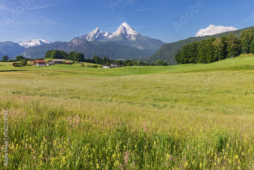 © Thorsten Schier, Fototapeta premium Eine blütenreiche Wiese mit Klappertopf bei Bischofswiesen in Bayern, Deutschland. Im Hintergrund in der Mitte das Bergmassiv des Watzmanns, ganz rechts der Gipfel des Hochkalters.