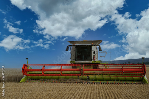 © sturmschaden, Fototapeta premium Eine Erntemaschine auf einem Feld bei der Ernte eines Weizenfeld
