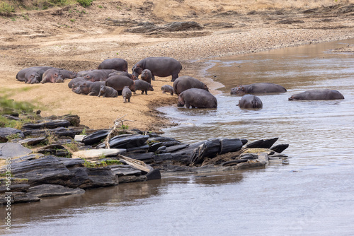 Fototapeta premium Eine Flusspferdherde mit diesjährigem Nachwuchs im und am Ufer des Flusses Mara