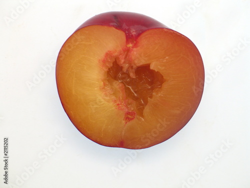 © Lucky Dragon, Fototapeta premium eine halbe frische rote Pflaume mit Kern freigestellt auf weißem Hintergrund