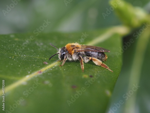 Fototapeta premium Eine Honigbiene beim ausruhen auf einem Blatt der Kirschlorbeere