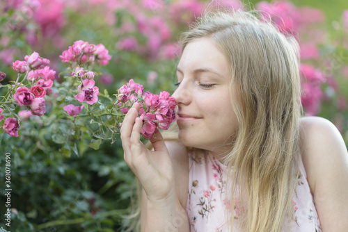 © SimonsArt-PhotoVideo, Fototapeta premium Eine junge Frau riecht Blumen