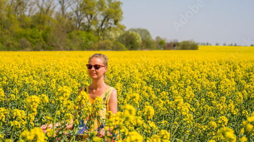 © jsr548, Fototapeta premium eine junge Frau sitzt in einem Rapsfeld in der Sonne
