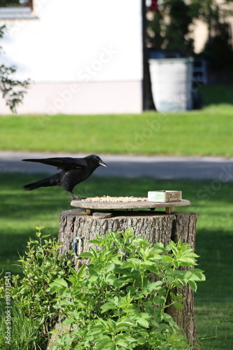 Obraz premium Eine Krähe landet am Futterplatz und sieht sich das Angebot an