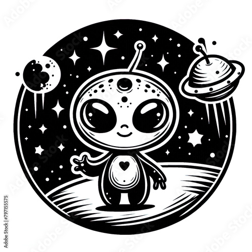Obraz premium Eine minimalistische schwarz weiße Vektorgrafik eines kleinen Aliens