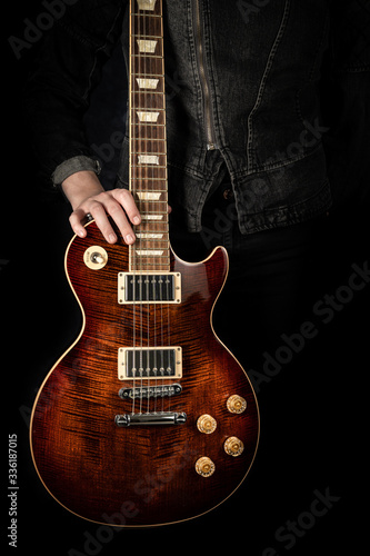 © Steffen, Fototapeta premium Eine rote E-Gitarre wird gehalten.