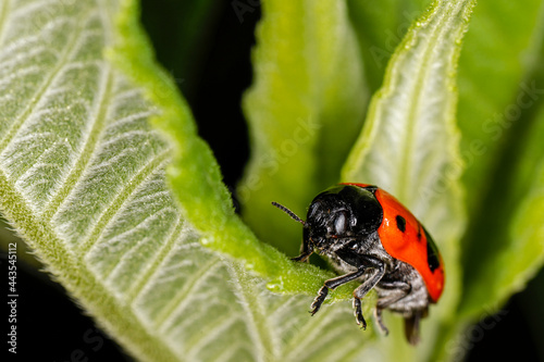 © jsr548, Fototapeta premium eine roter Käfer mit Punkten auf einem grünen Blatt