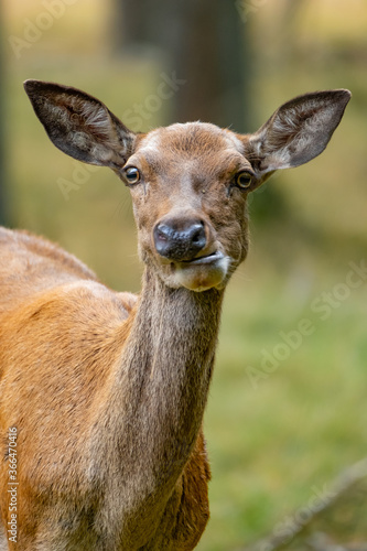 Fototapeta premium Eine Rothirschkuh kaut auf einen Zweig