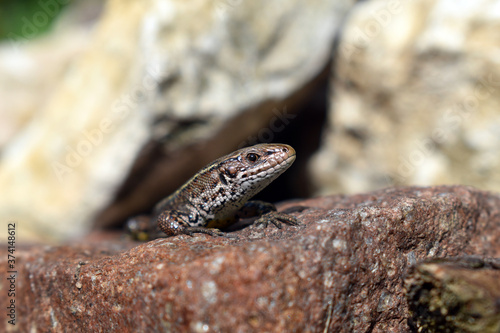 Fototapeta premium Eine Waldeidechse wärmt sich auf einem Stein