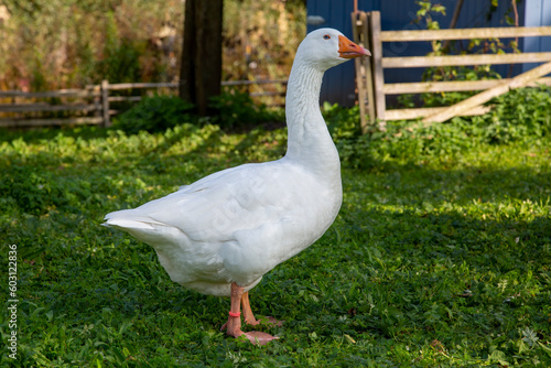Fototapeta premium Eine weiße Hausgans auf der Weide eines Bauernhofs