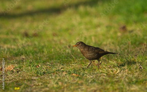 Fototapeta premium Eine weibliche Amsel sitzt im Frühling am Abend bei Sonnenschein auf einer grünen Wiese, turdus merula