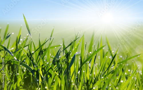 Fototapeta premium eine Wiese im Frühling mit Morgentau und den Strahlen der aufgehenden Sonne
