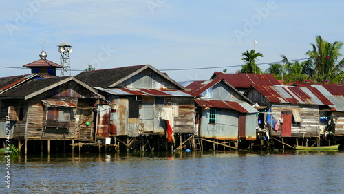 © globetrotter1, Fototapeta premium einfache Hütten stehen auf Pfählen im Fluss Martapura und spiegeln sich im Wasser