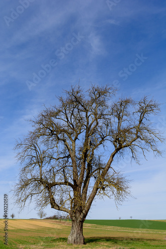 © Tobias, Obraz premium Einsamer Baum auf farbiger Wiese vor blauem Himmel mit Wolken