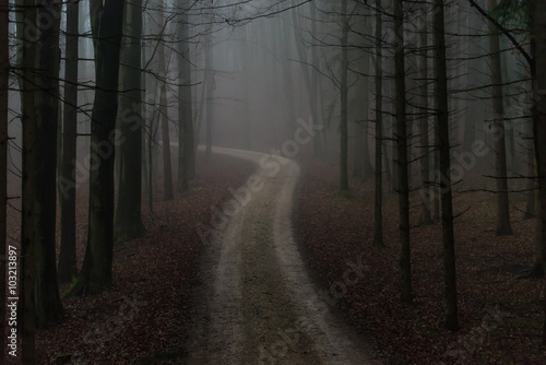 Fototapeta premium Einsamer Waldweg im Morgennebel