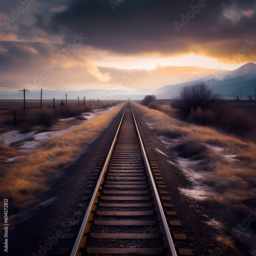 © Jakob, Fototapeta premium Einzelnes gerades Zuggleis in schöner einsamer Landschaft unter Himmel