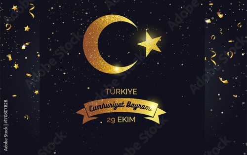 Naklejka premium 29 ekim Cumhuriyet Bayrami, Republic Day Turkey. Greeting card with golden sparkling emblem and confetti. Vector illustration