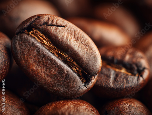© Silent26, Obraz premium Ekstremalne zbliżenie na pojedyncze, świeżo palone ziarno kawy, leżące na stosie innych ziaren. Ziarno ma głęboki, ciemny kolor i widoczną bruzdę.