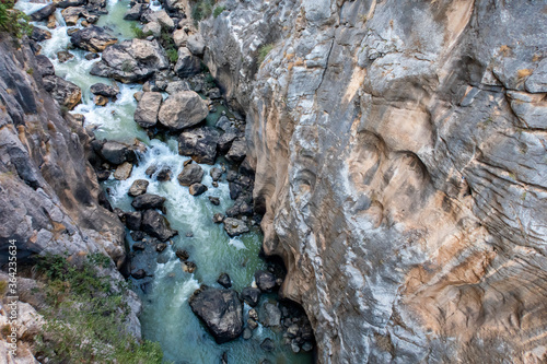© Cleop6atra, Fototapeta premium El Caminito del Rey in El Chorro gorge, Spain, view from above of the deep precipice with wild river, rocks and stones, dangerous walkway on wooden platforms attached to vertical walls of the gorge.