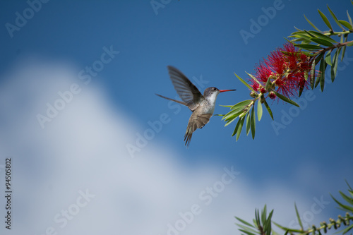 © jesuschurion57, Fototapeta premium El colibrí se acerca al néctar con un fondo de nubes.