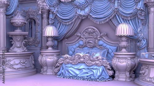 Fototapeta premium Elaborate Blue Bedroom Interior with Ornate Baroque Furniture and Detailed Sculpted Decor