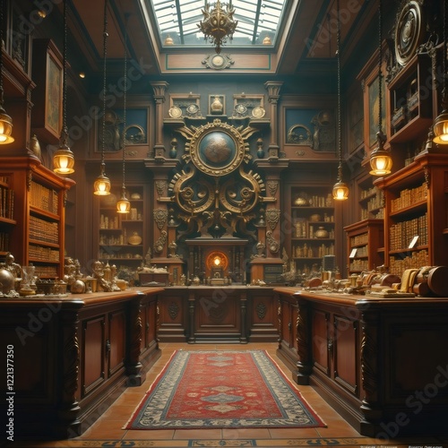 Obraz premium Elaborate Steampunk Library with Ornate Details and Warm, Atmospheric Lighting