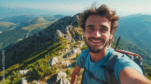 © kamonrat, Naklejka premium Elated hiker grins on a mountain peak selfie. Sunlight bathes him in golden light, while breathtaking scenery stretches behind.