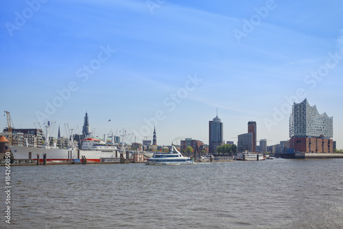 Naklejka premium Elbe river, piers and Hafencity quarter at Hamburg, Germany