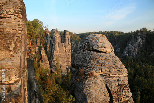 © bummi100, Fototapeta premium Elbe Sandstone Mountains at sunrise-Bastei Saxon Switzerland, Germany