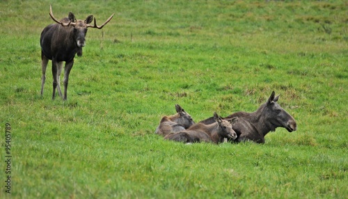 © Schmutzler-Schaub, Naklejka premium Elchfamilie (Alces alces) mit fünf Monate alten Zwillingen