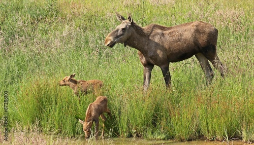 © Schmutzler-Schaub, Naklejka premium Elchkuh (Alces alces) mit 11 Tage alten Zwillingen
