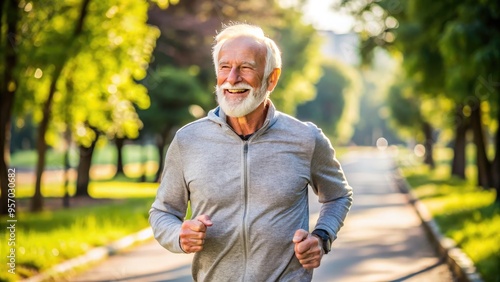 © Man888, Obraz premium Elderly adult with silver hair and bright smile, wearing casual athletic attire, jogging outdoors on a sunny day, exuding joy and freedom.