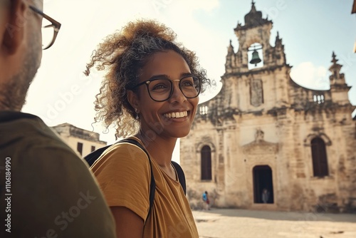 Fototapeta premium Elderly artist discusses designs with visitor outside chapel in natural light