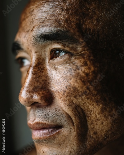 Obraz premium Elderly Asian man, natural light, visible freckles on his face.