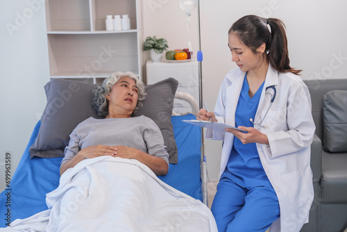 Obraz premium Elderly Asian woman lying in hospital bed looking unwell, with young Asian doctor take a history of illness Health check and encouragement.