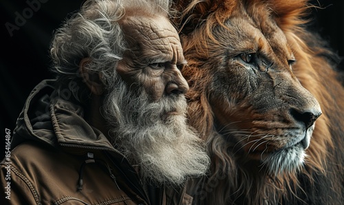 © Olha, Naklejka premium Elderly bearded man in a jacket next to a huge lion on a black background
